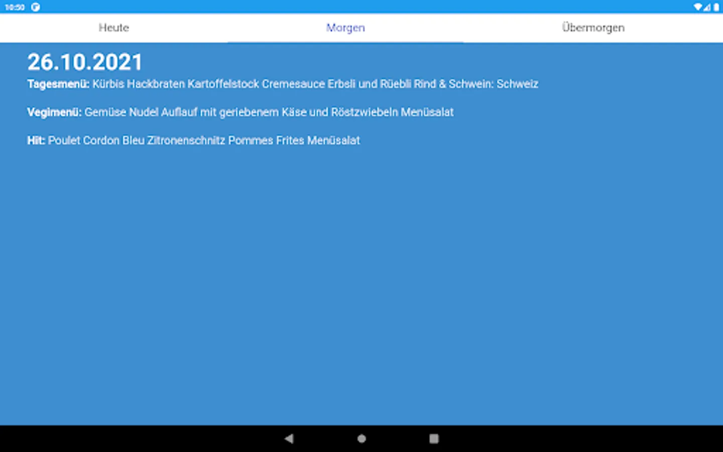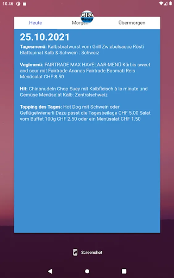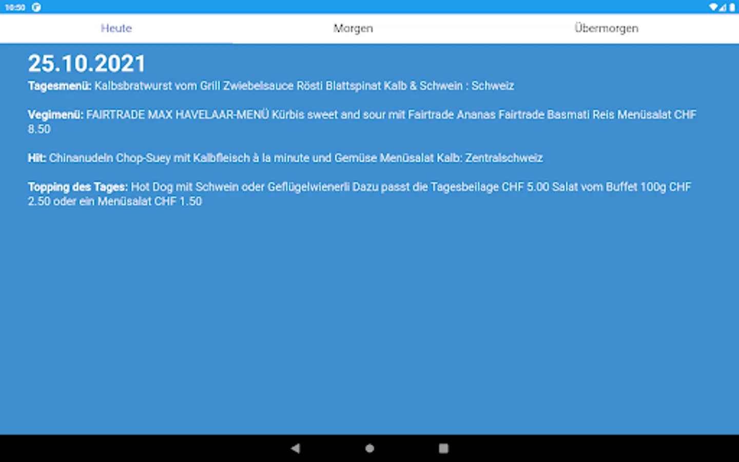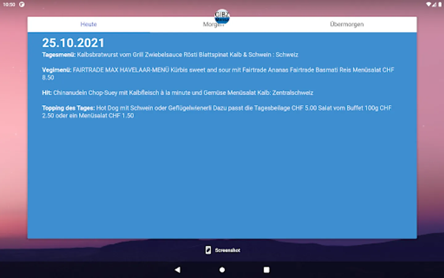 In the app you can view the menu of the GIBZ cafeteria for today, tomorrow and the day after tomorrow.