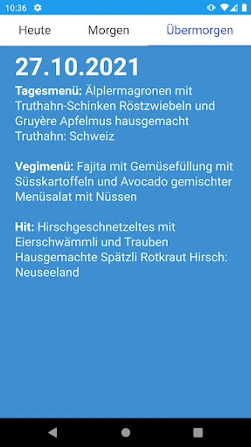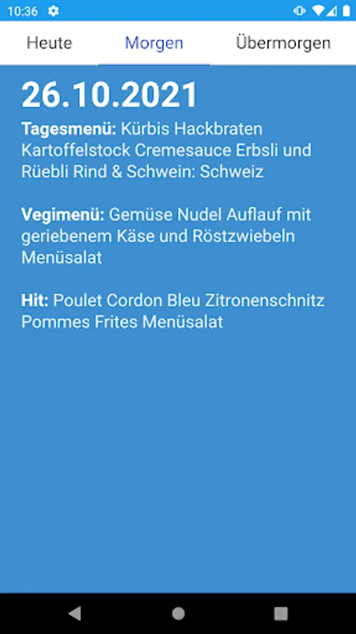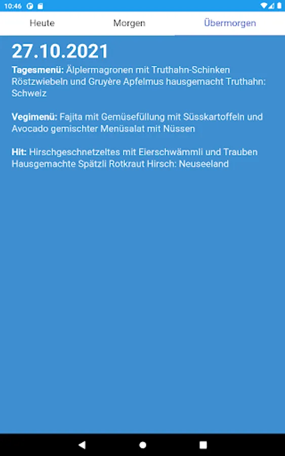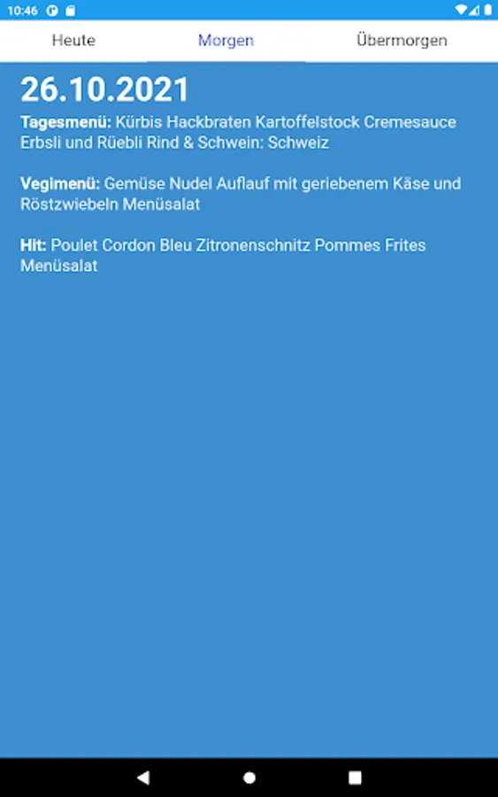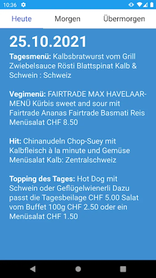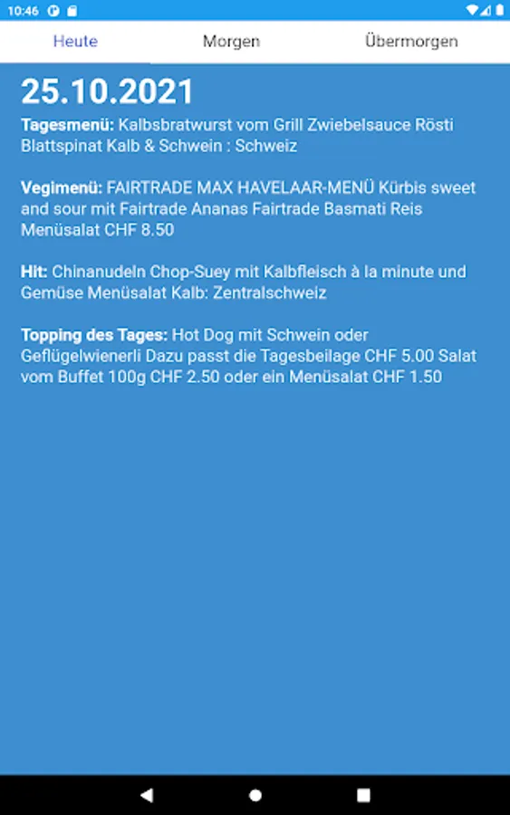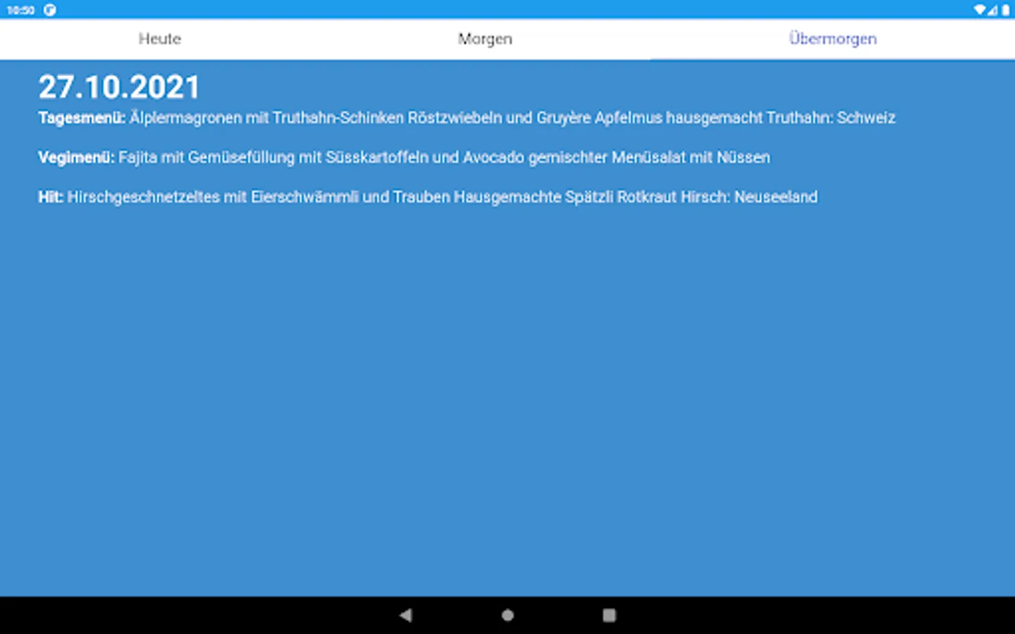 In the app you can view the menu of the GIBZ cafeteria for today, tomorrow and the day after tomorrow.