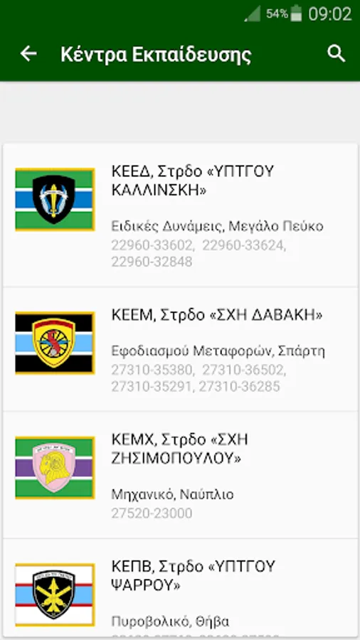 * Τα Κέντρα Εκπαίδευσης Νεοσυλλέκτων (όνομα , περιοχή , σώμα . έμβλημα , τηλέφωνο).δίνεται η δυνατότητα απευθείας κλήσης των κέντρων