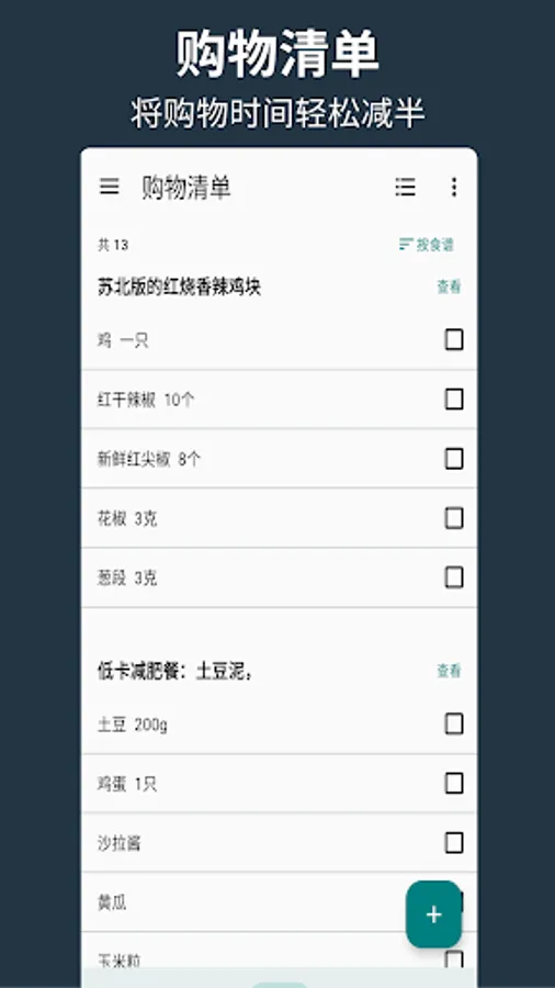 4. Shopping list: Add recipes to the shopping list with one click, and classify according to recipe or ingredient type, saving your shopping time.