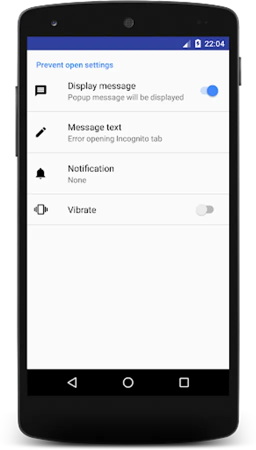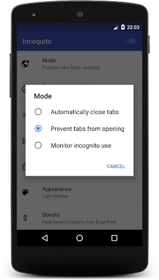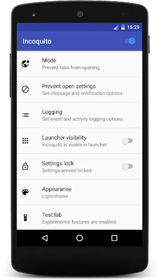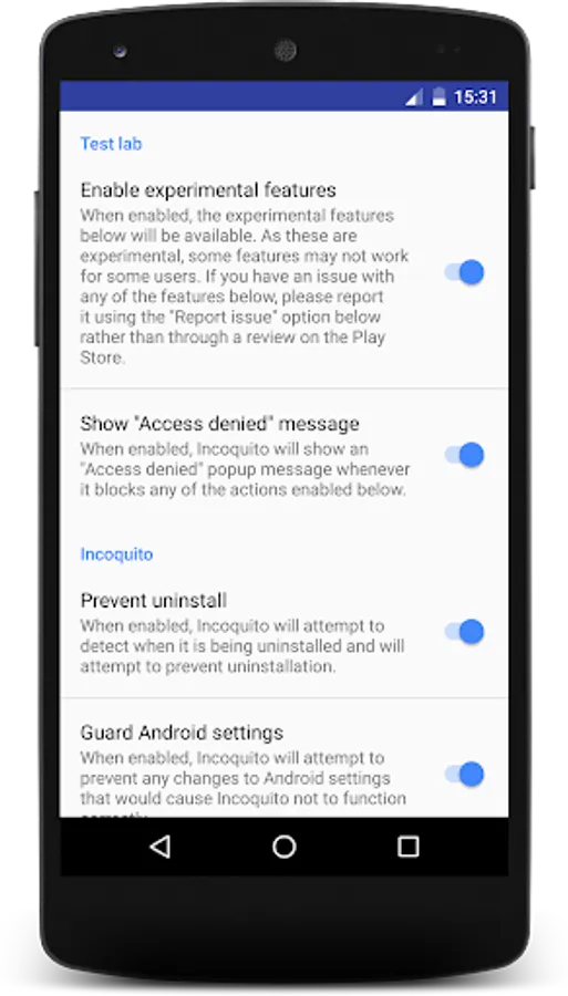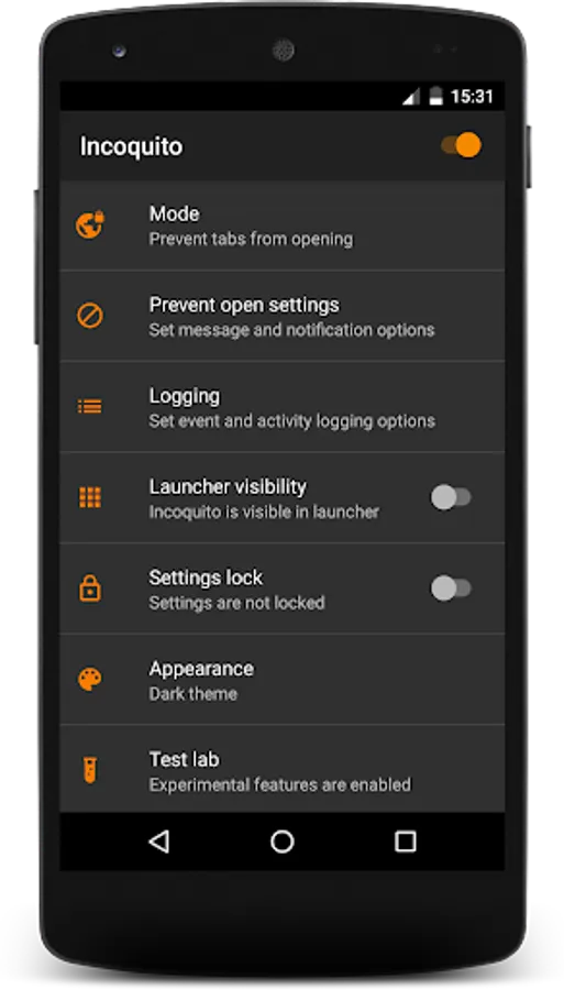 ○ Guards Android settings and prevents changes to any settings that would affect the operation of Incoquito.
