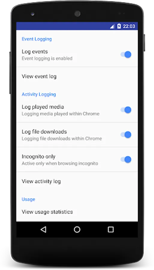 ○ Logs media playback and file download activity from within Chrome. Logging can be enabled for all browser sessions or only when there are incognito tabs open.