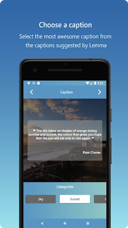 Never again waste time searching for captions and hashtags on the internet. Lemma uses Artificial Intelligence to automatically fetch the best captions for you so that you can spend time creating memories.