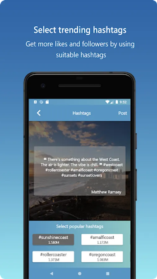 Lemma also provides top hashtags that can go with your post to make you get you more likes and followers.