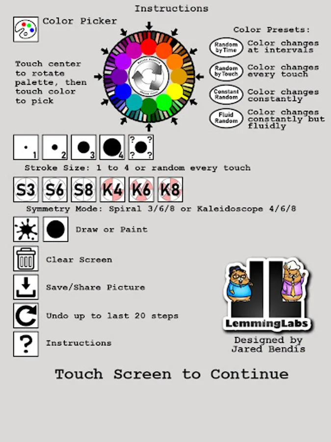- Draw in Random modes which allows you to have the app randomly change brush sizes every time you lift up your finger or choose one of 4 random color modes.