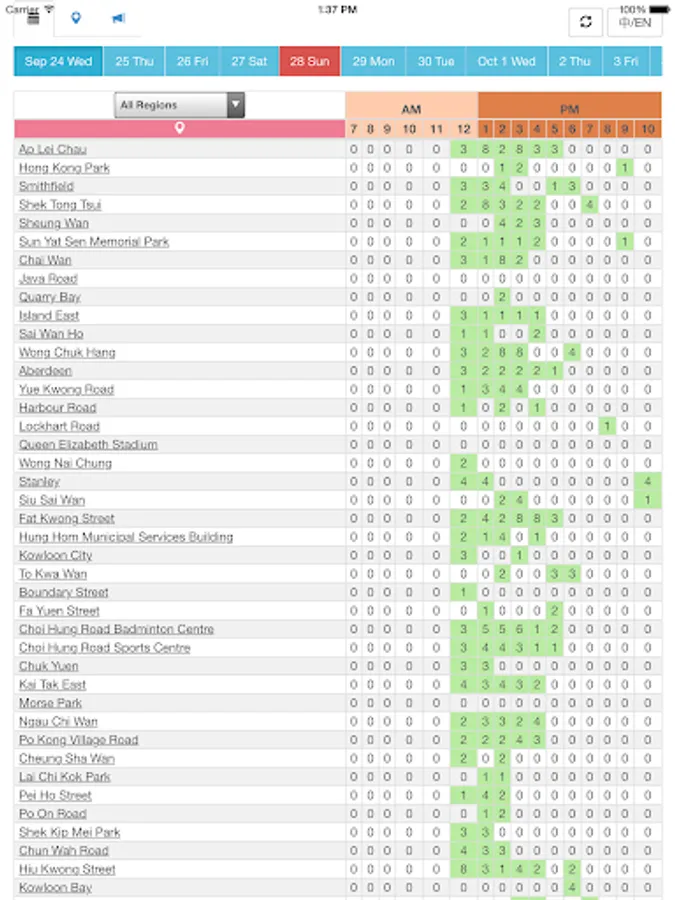 Pick the date, then area and venue. Green time slots means there are free courts, the number inside show the total number of available courts. Simple as that!