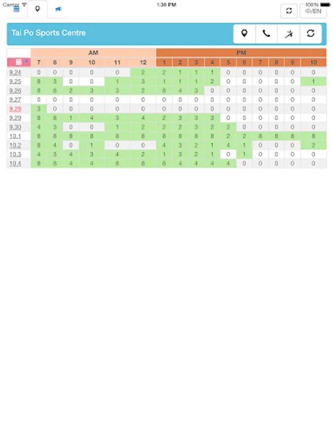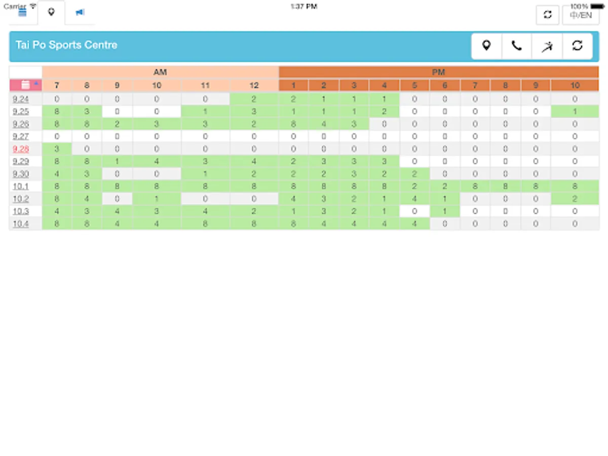 Click the venue name in 'Date Mode' and you will land here, where you will see the free courts in the coming 11 days.