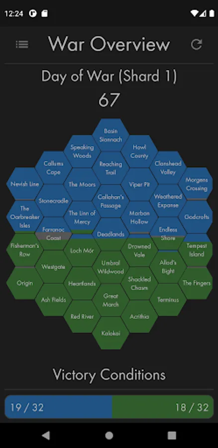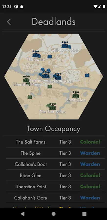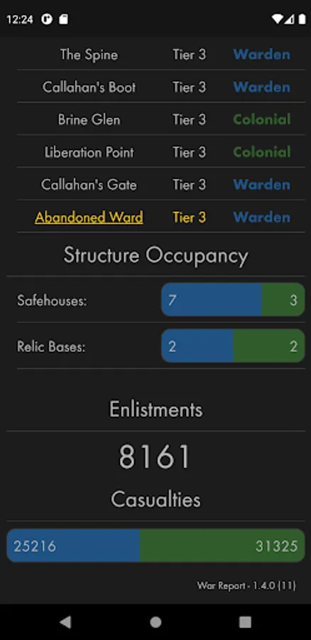 War Report displays an overview of the ongoing in-game war. The app displays how many in-game days have elapsed since the start of the war, how many casualties and enlistments there have been and an overview of the Warden and Colonial occupation of each region. A detailed map is provided for each region, showing the occupation of relevant towns and structures such as forts, safe-houses, observation towers and rocket sites. Detailed enlistment and casualty information is also provided per region.