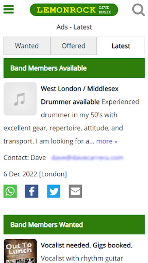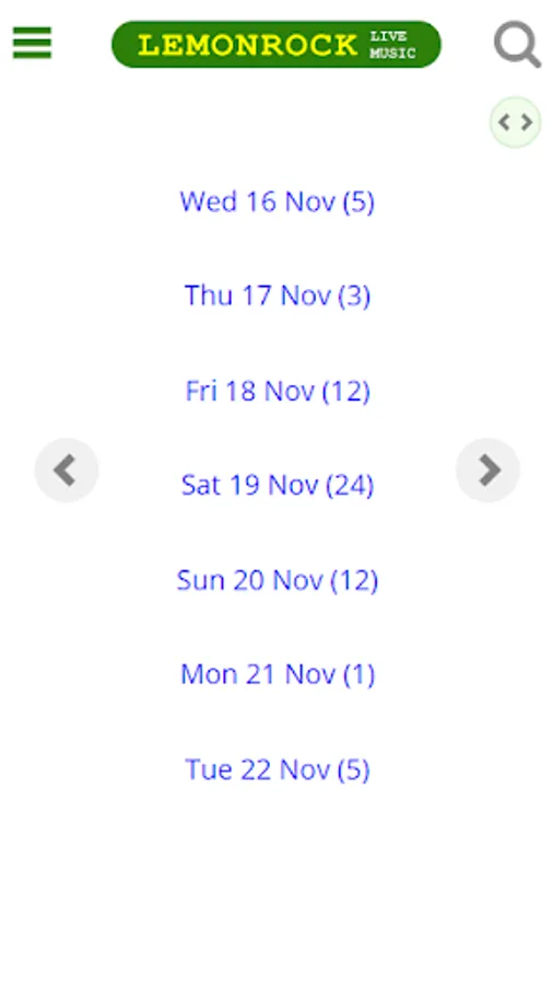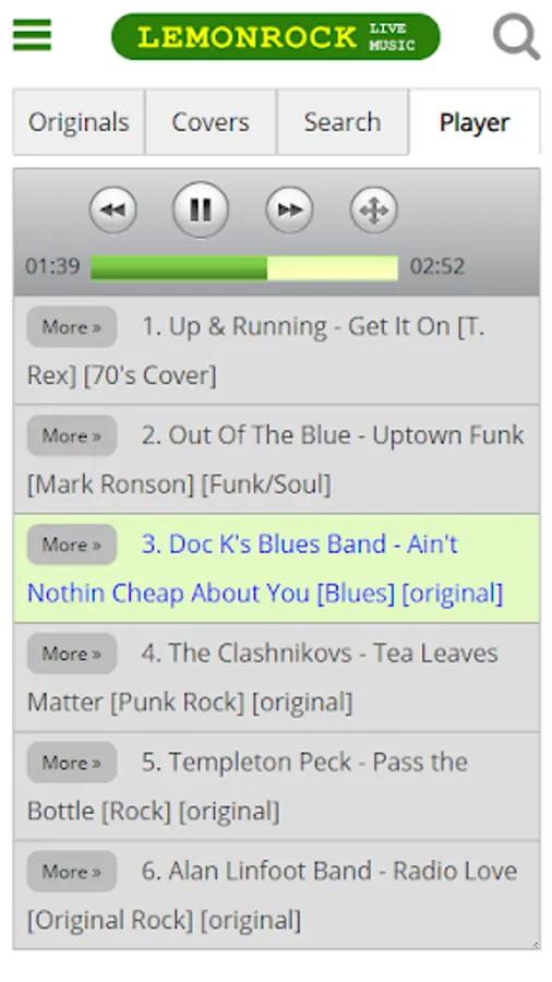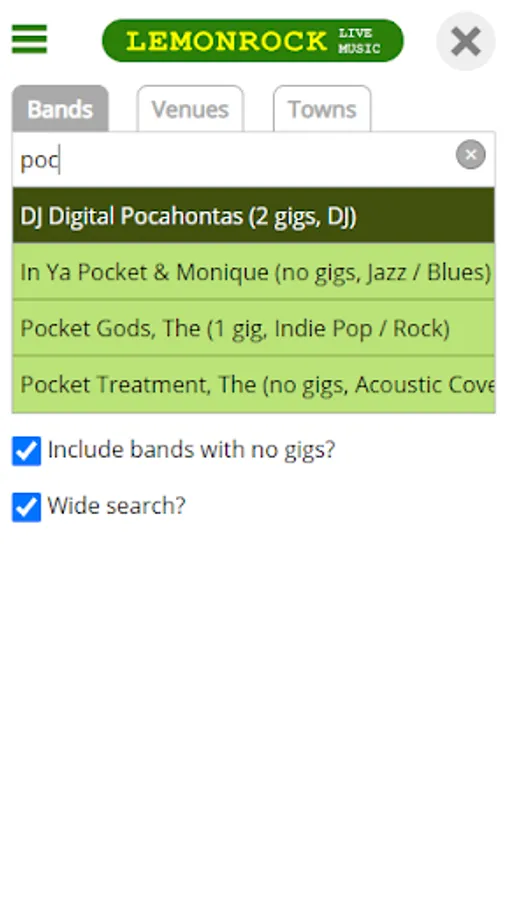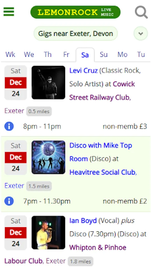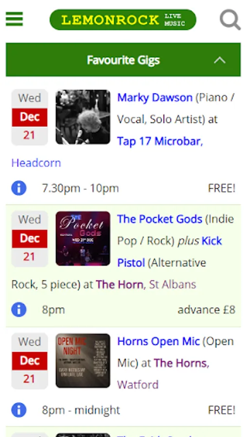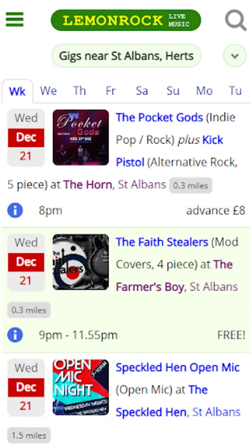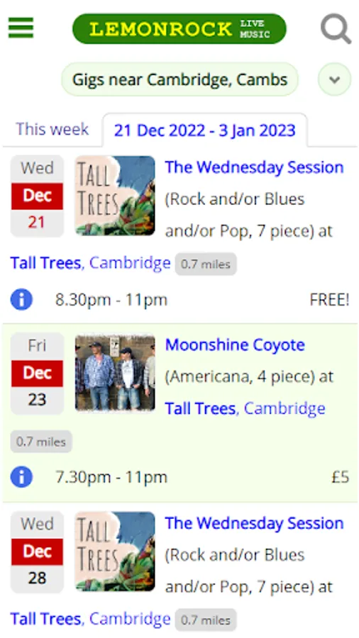 Lemonrock shows you the gigs nearest to you, but you can store dozens of different locations, and swap between them. You can download gigs to your calendar, and listen to thousands of uploaded song recordings.