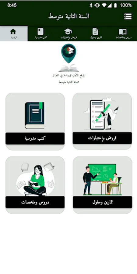 The application of the second year average contains everything that the Algerian student may need from lessons and summaries, test models and suggested topics, important information, exercises with the solution, lesson programs, external books for download, tips and directions in addition to files related to professors and teachers such as notes and books Professors in some of the subjects and curricula followed, and this has become a special bond that teachers and students rely on alike
