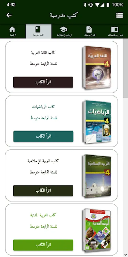 The fourth year average application contains everything that the Algerian student may need from lessons and summaries, test models and suggested topics, important information, exercises with the solution, lesson programs, external books for download, tips and directions in addition to files related to professors and teachers such as notes and books Professors in some of the subjects and curricula followed, and this has become a special bond that teachers and students rely on alike