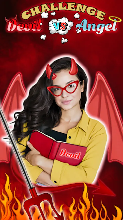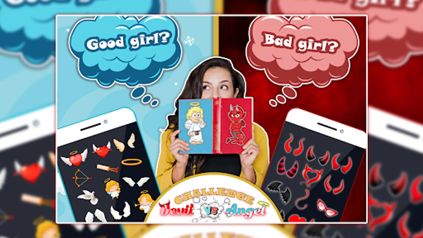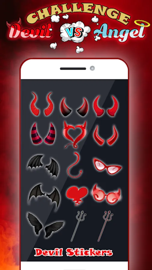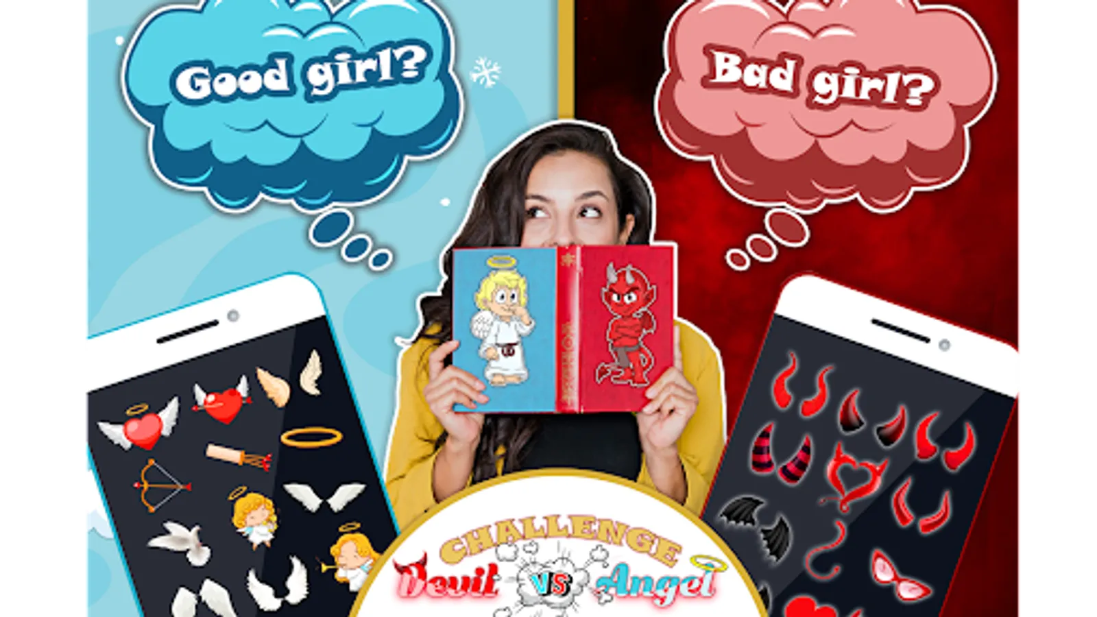 Beautify all your selfies with this Devil or Angel Sticker Challenge. Apply the photo filters and effects from devil eyes to angel wings. Make your photos scary by editing images in the demon wings photo editor, or find the easiest way to create an angel face photo montage.