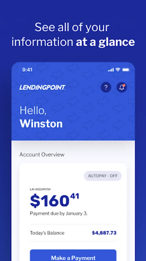 Welcome to the LendingPoint app, a comprehensive mobile application created to empower individuals in effectively managing their finances. By utilizing the app's capabilities, users can pave the way toward financial well-being and confidently achieve their long-term financial goals. Whether you're interested in checking rates for a personal loan or already have a loan with LendingPoint, the app covers you. Experience a hassle-free way to manage your account, make payments, and update your personal information all in one place. The LendingPoint app is designed to be your comprehensive solution for all your financial needs.