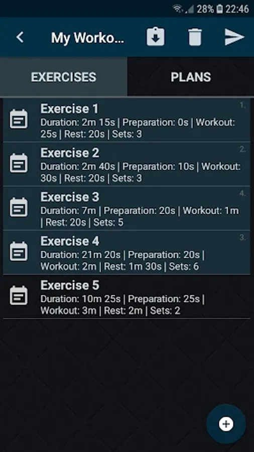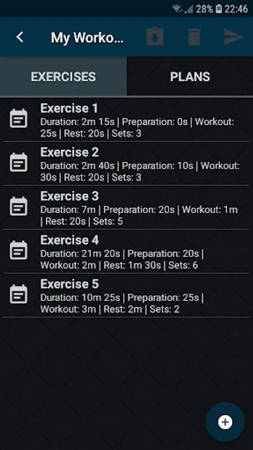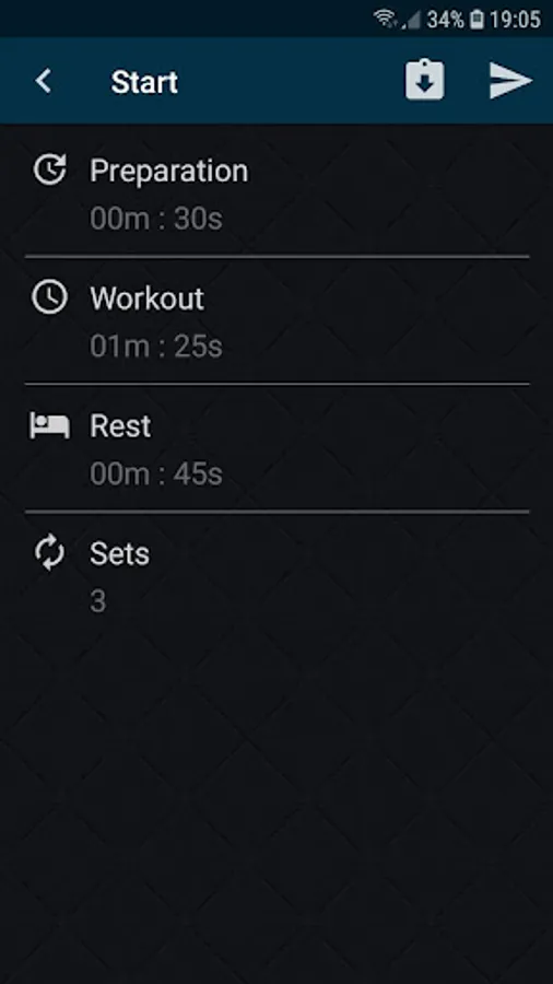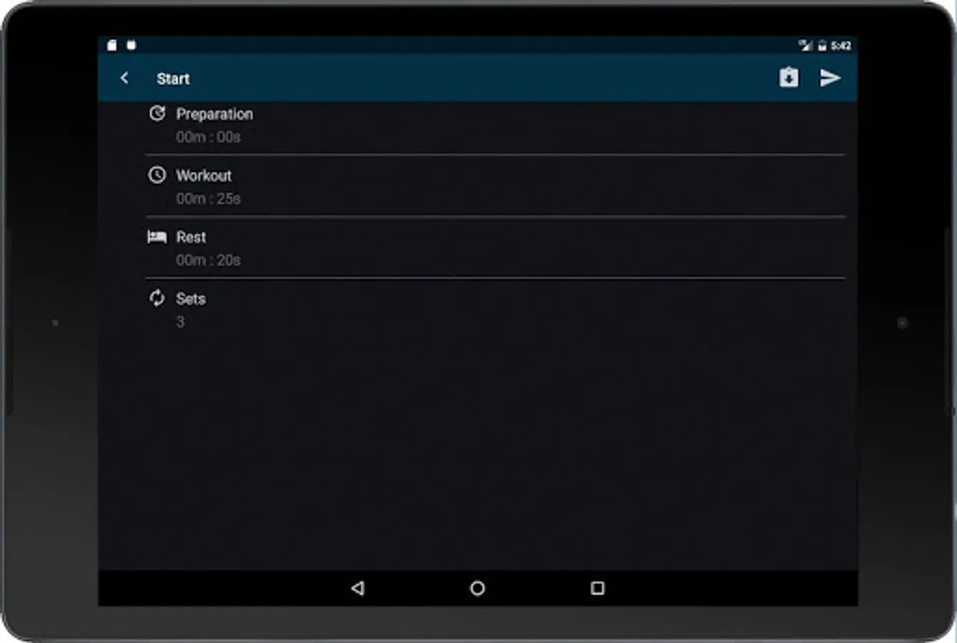 - Configure exercises (preparation time, exercise time, pause time, number of repetitions)