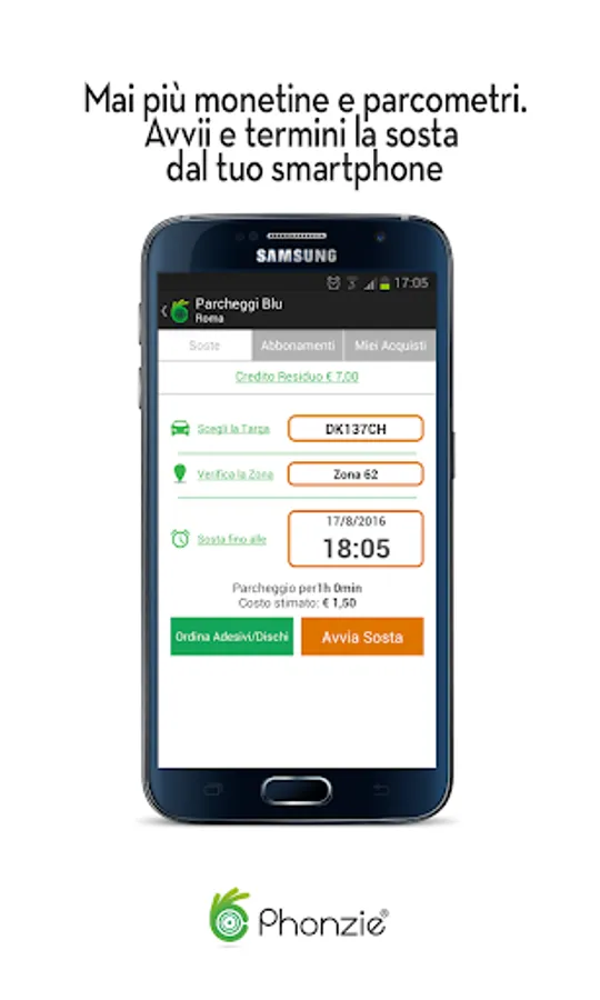 Phonzie is the only app that does not apply additional costs to pay for parking. Thanks to Phonzie it is possible to pay only the actual parking minutes and renew the parking from wherever you want and when you want.