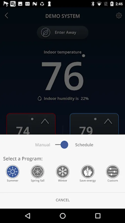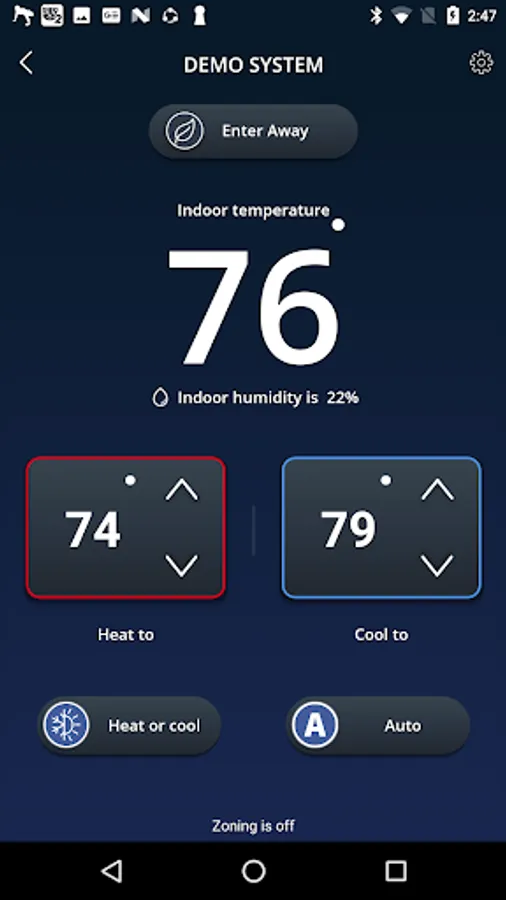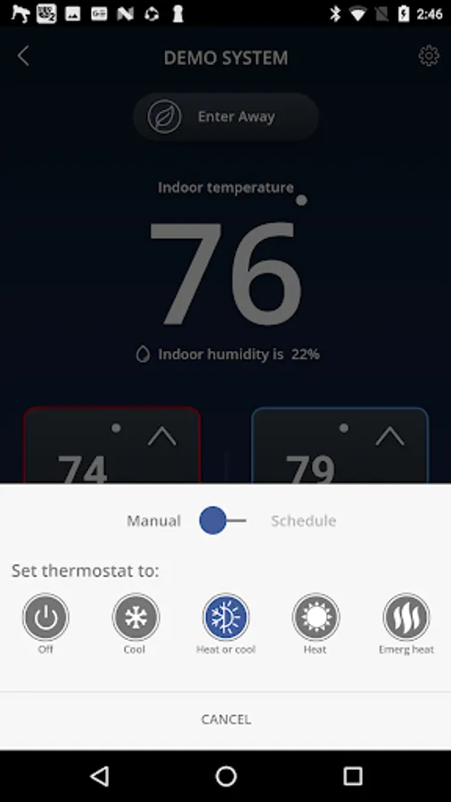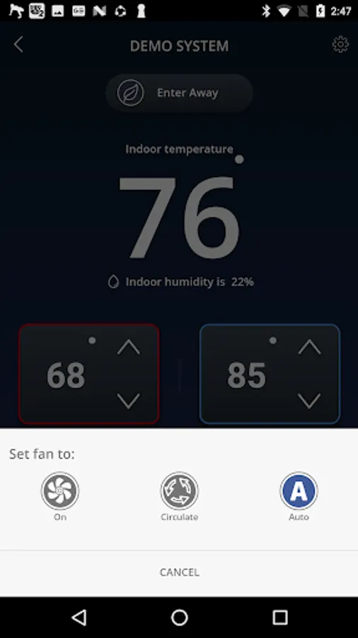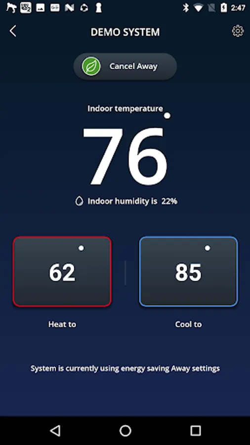 Leave the house and forget to dial back the thermostat? Simply start the app and use the one- touch away mode to save energy the entire time you are gone. Cancel the away mode before you get back to return to a perfectly comfortable home.