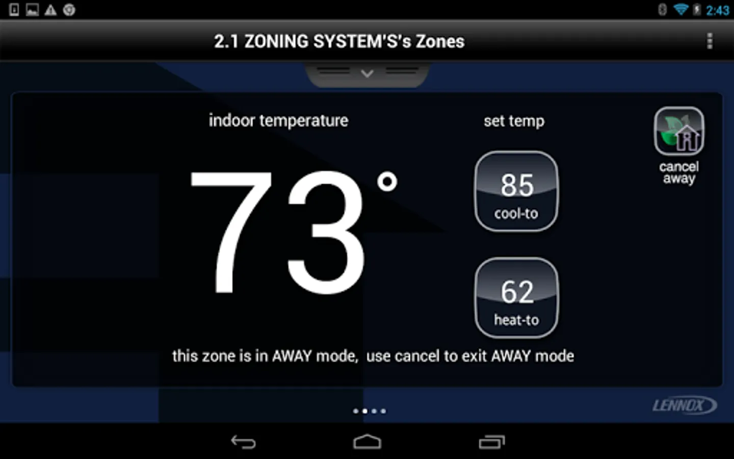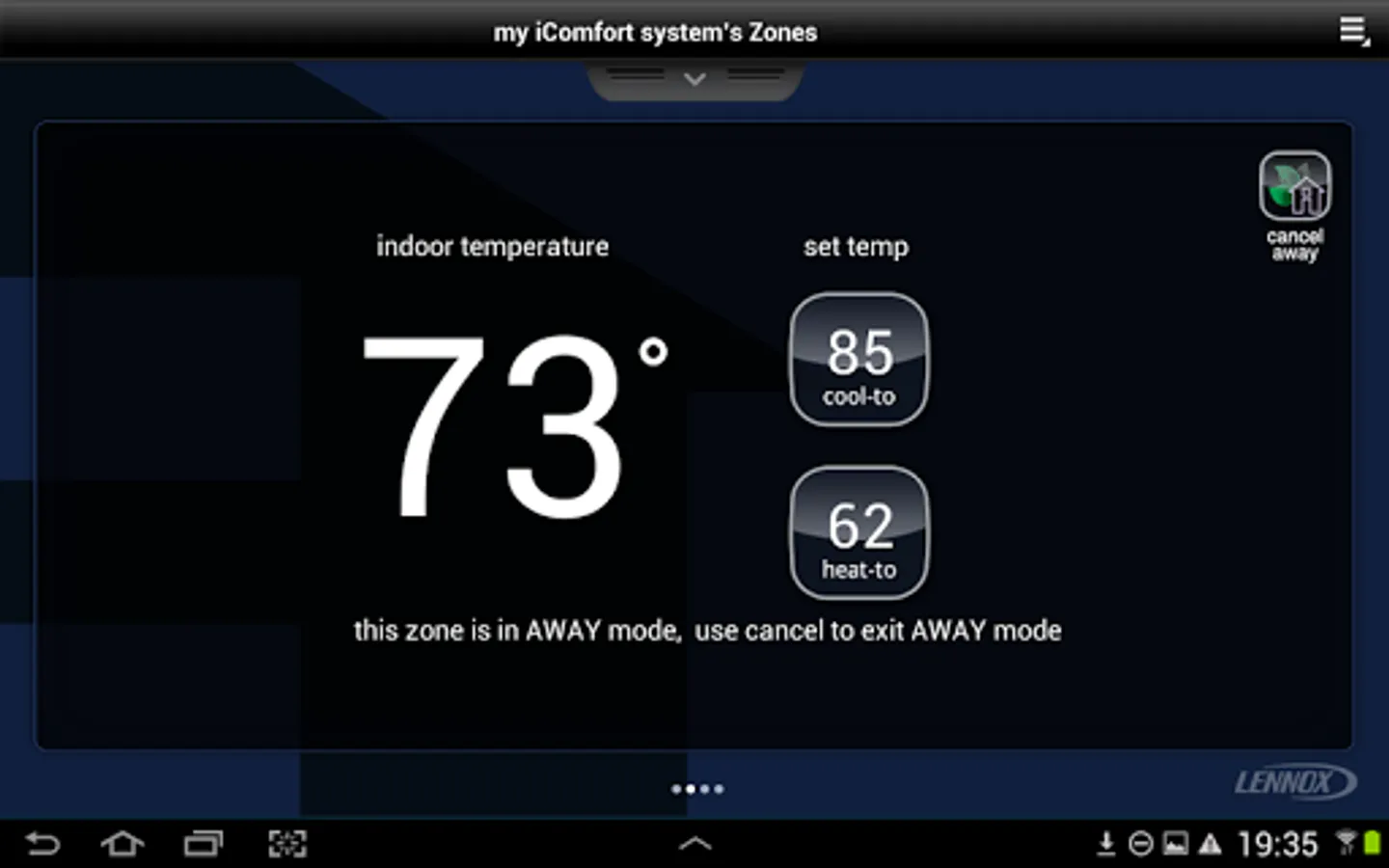 Leave the house and forget to dial back the thermostat? Simply start the app and use the one- touch away mode to save energy the entire time you are gone. Cancel the away mode before you get back to return to a perfectly comfortable home.
