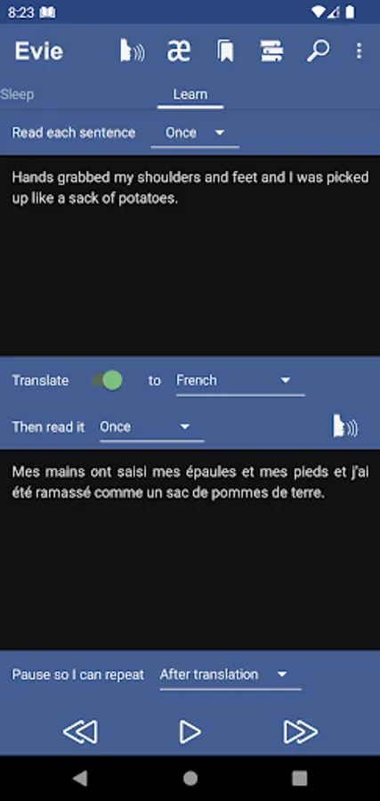 Evie can translate each sentence on the fly, then read the translation out loud to you.
