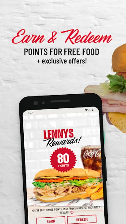 Hey Lennys Lovers! Welcome to Lennys Rewards, where getting rewarded for our purchases has its perks! Earn and redeem rewards points for FREE food, get exclusive offers, and be the first to see our new menu items! Plus, take advantage of our order ahead option to save time for pick up or delivery, and customize your favorite subs!