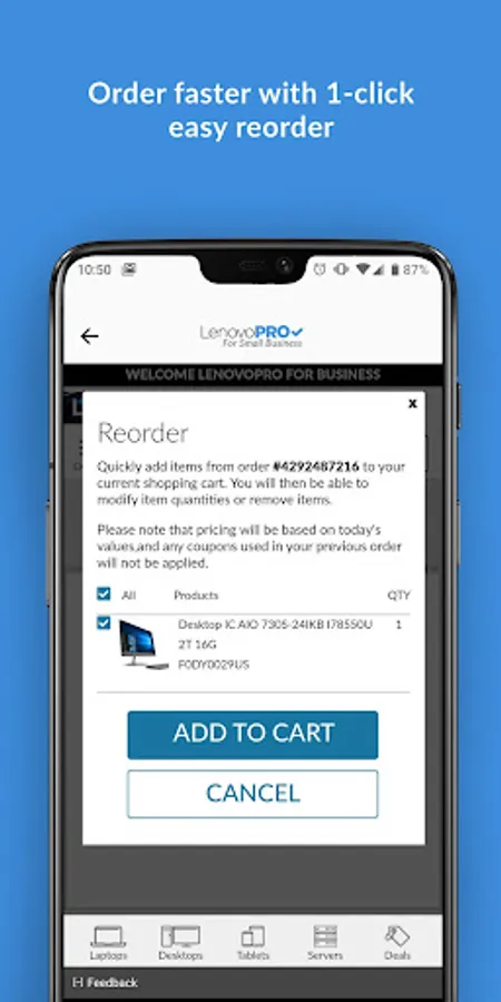 • Log in with your LenovoPRO account to access your saved carts, past orders, and discounts
