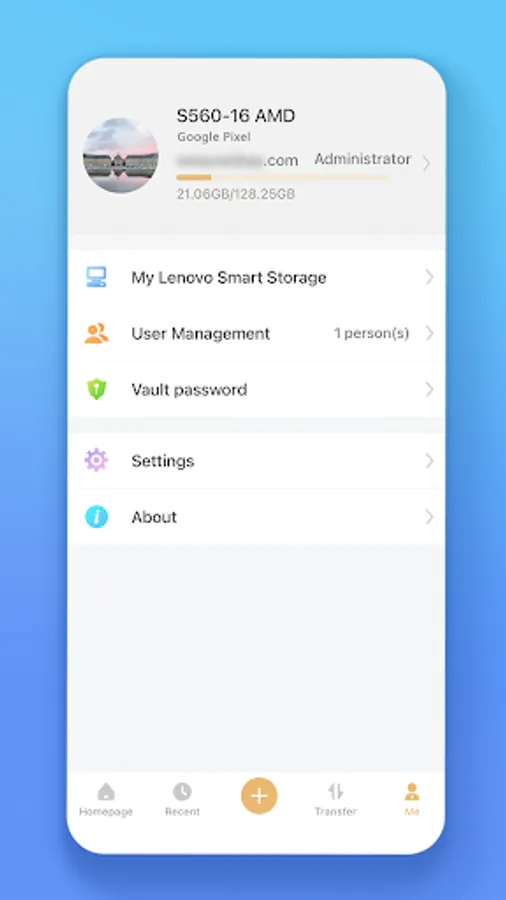 Lenovo Smart Storage server uses your PC as a storage center. Install Lenovo Smart Storage client version app, you can back up your phone/tablet data to this data center and access conveniently. And share your files with other smart storage users anytime