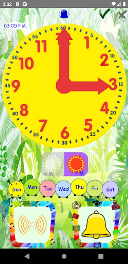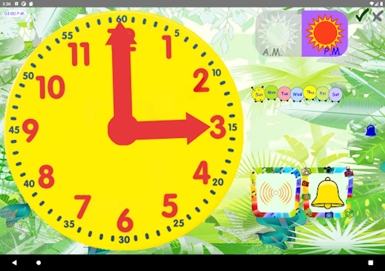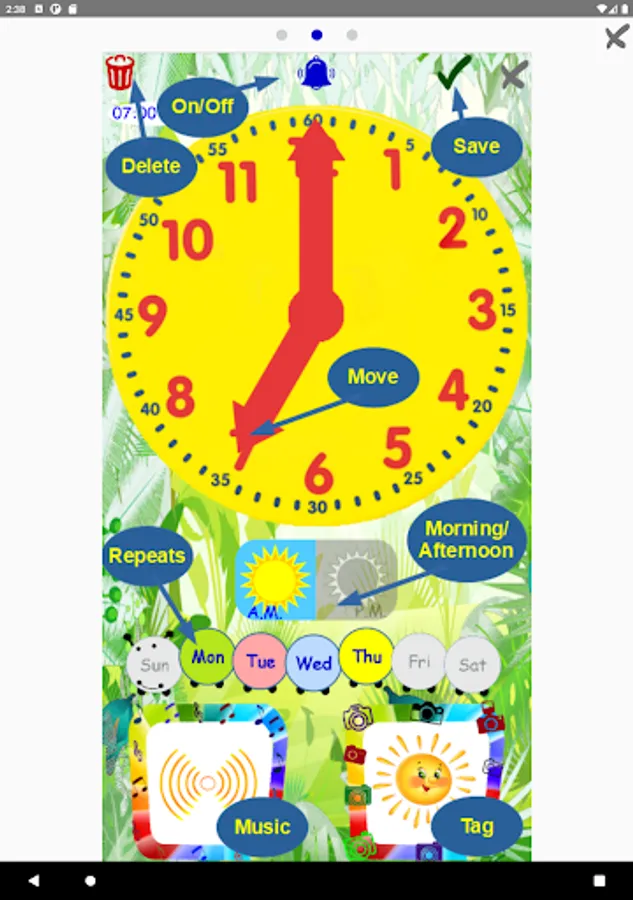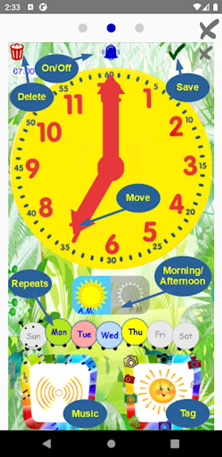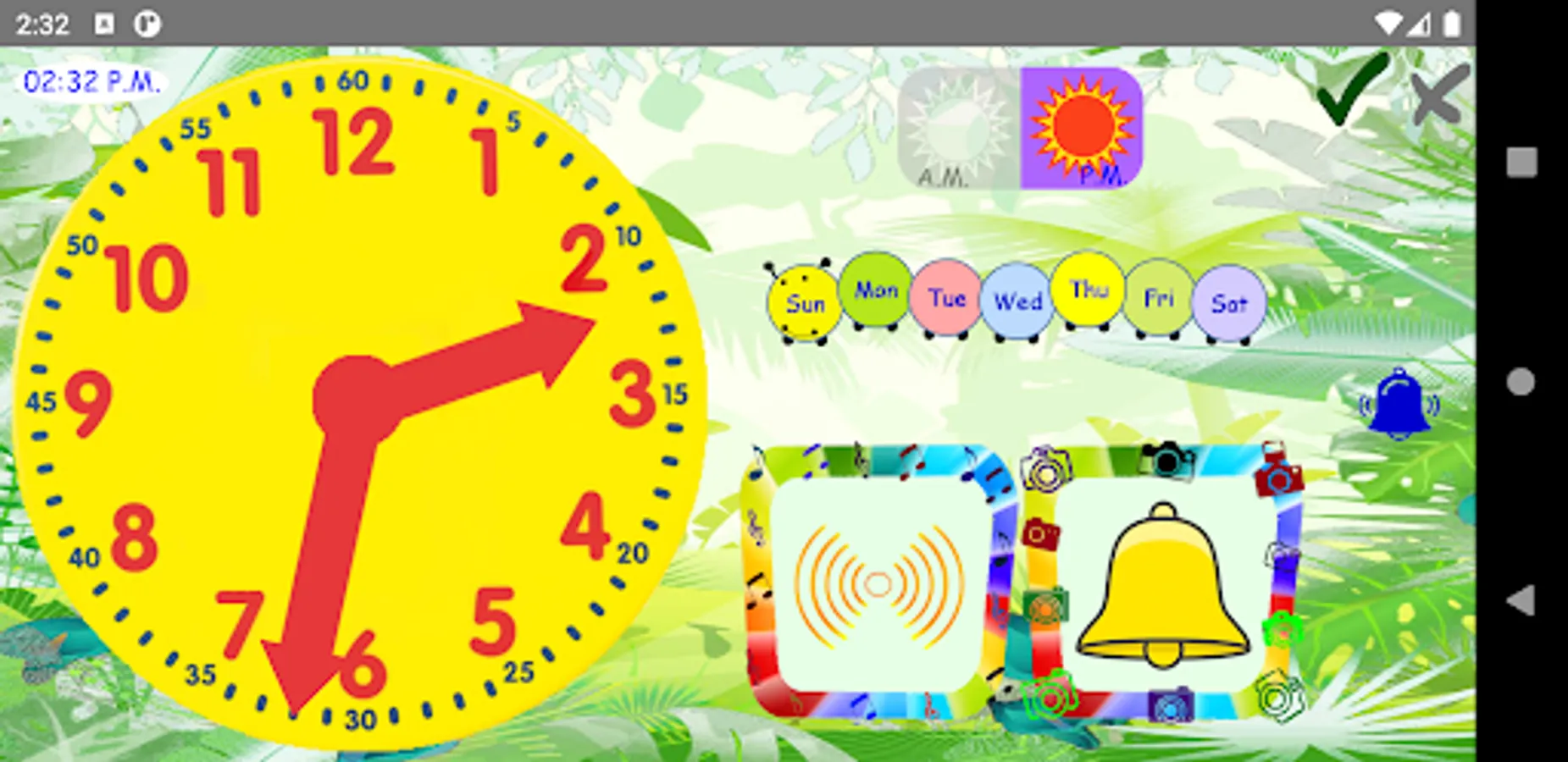 This free alarm clock is designed for children. Move the clock hands to set time. Select different tags (pictures) and music. Choose among popular melodies. It supports 12-hour and 24-hour time formats. Teach children to set a time. This application has a realistic and big clock, quick and easy to use on small screens.
