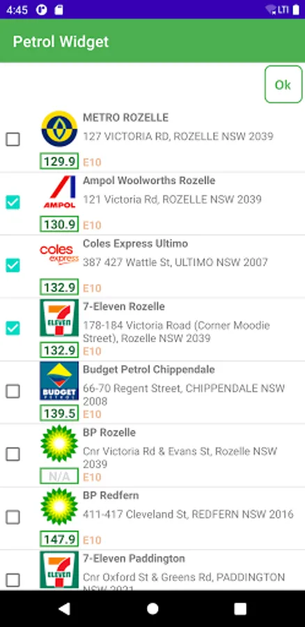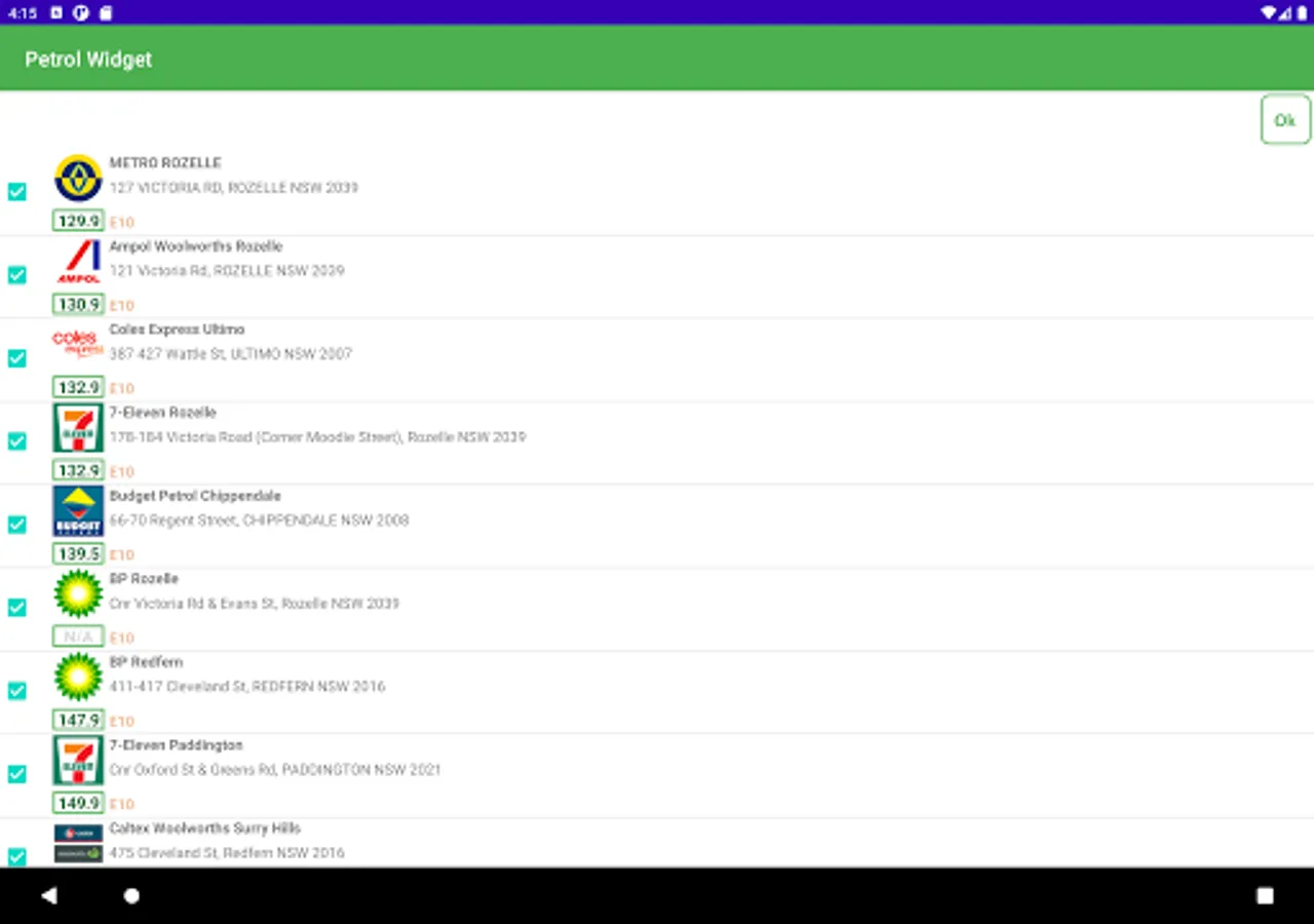 The application will fetch all available petrol stations for the area. Use checkboxes to select stations that you wish to add to the list. Press 'Ok'.