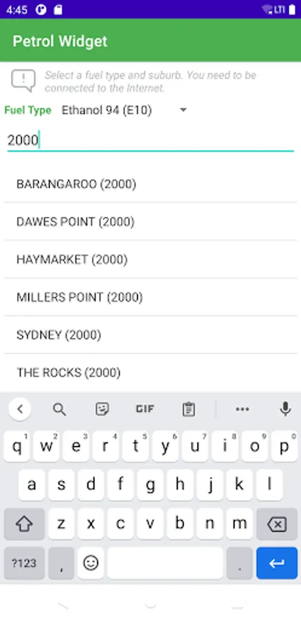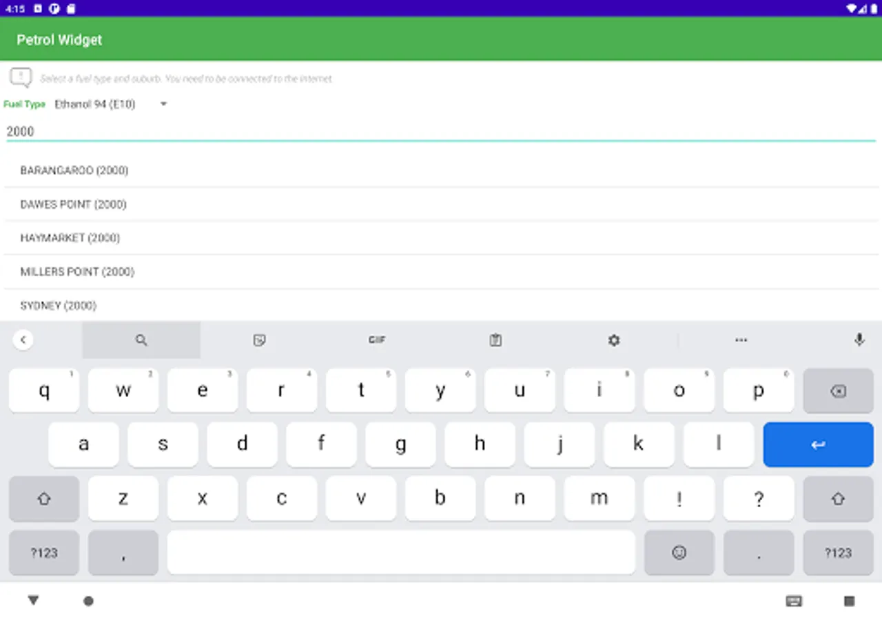 On the next screen, select the fuel type and start typing a postcode or suburb name. A list of the available options will be displayed.