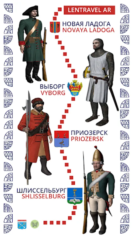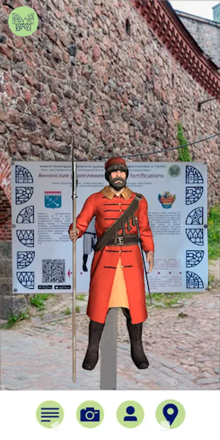 Travelers passing along the tourist routes of the cities of Novaya Ladoga, Vyborg, Priozersk, Shlisselburg can point their smartphone (tablet) at the information plate and see a full-length 3D historical character in front of them in augmented reality and listen to the audio guide from the lips of this hero and take some photos on memory.