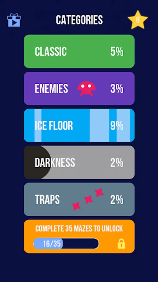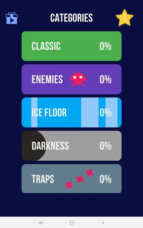 👾 6 categories: Classic, Enemies, Ice Floor, Darkness, Traps, and Time Trial.