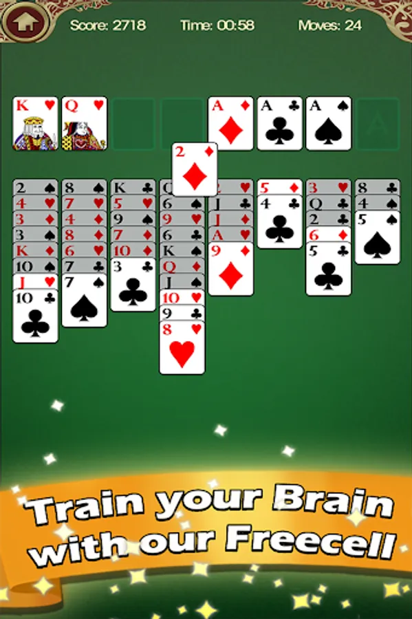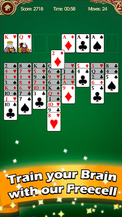 FreeCell Solitaire adds a new element of strategy to the classic solitaire games Klondike. The term FreeCell is given to the four empty spaces above the tableau that are used for the temporary storage of cards. After dealing from a standard deck of 52 cards, use the four free cell spots as placeholders as you try to move all of the cards from the Foundation stacks for a win. Just like Klondike, the object of the game is to build the four HomeCells up in ascending suit sequence from Ace to King with cards of identical suits. Nearly every single game of FreeCell can be won with proper play and strategy.