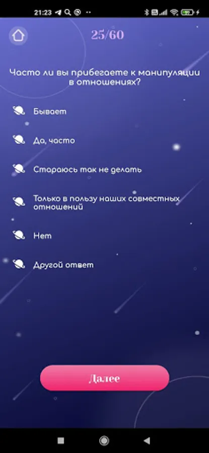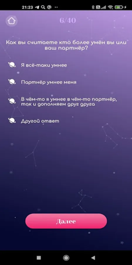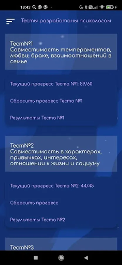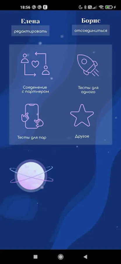 The application must be downloaded for 2 devices, one of the partners must enter the code of the other and you can proceed to the passage. For the best effect, it is better to pass the test together to hear about discussing each other's answers. So you get to know each other from all sides, understand how much you fit together and where you still need to work on relationships or on yourself. This test was developed by a psychotherapist based on the needs, habits and already established views and experiences of people. Therefore, he will be a kind of reception for you and a test of your relationship with a psychologist. Good luck!