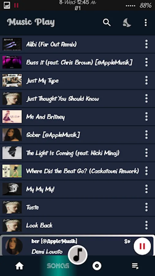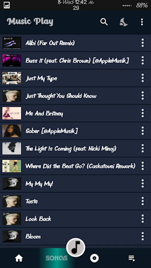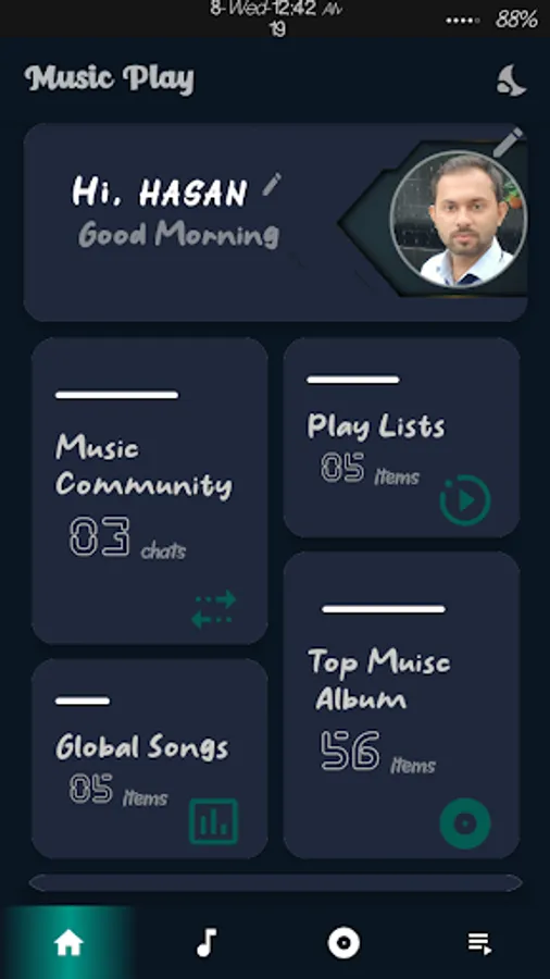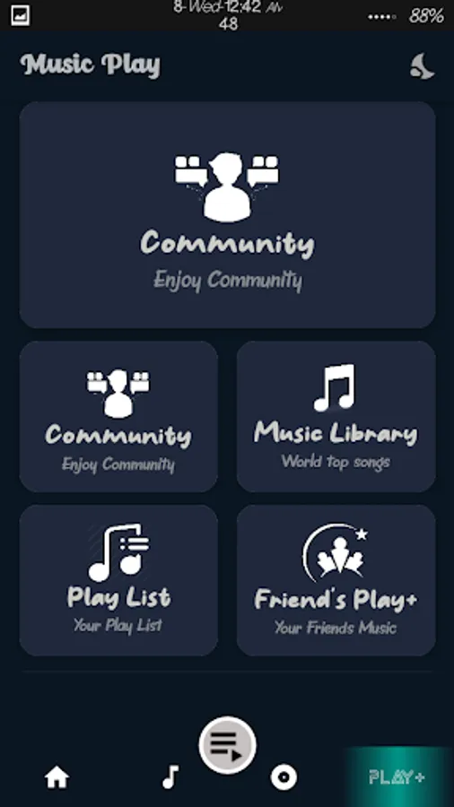 ✓ Home, Songs, Album and Play+ four navigation items gives users cool look.