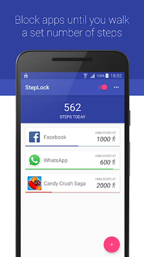 Simply pick the app from a list of installed apps on your device, sets the amount of steps needed for you to use it and get walking! StepLock will count your steps, and block the app when you open it if the steps target is not reached.