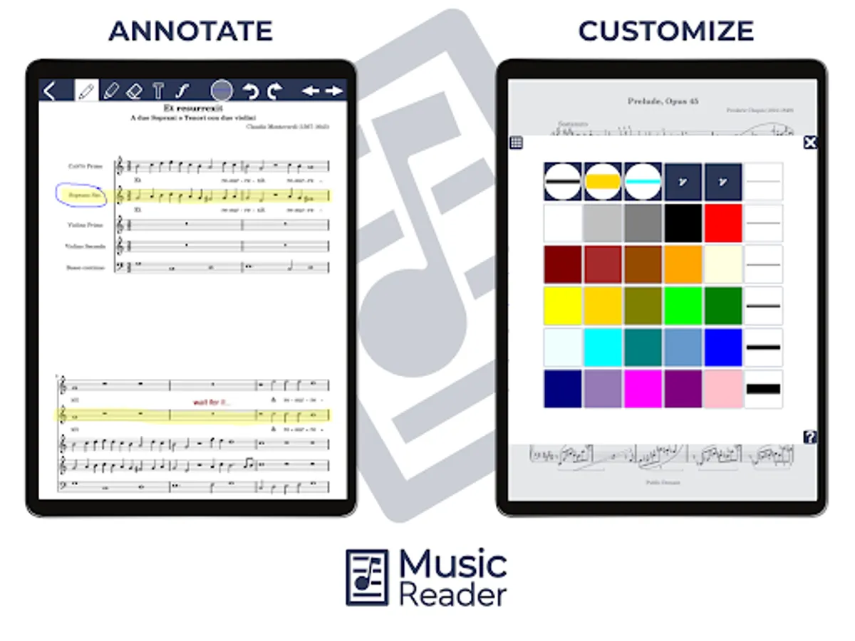 * In-app Annotations: Use pencil, marker, text, and symbols to mark your scores. Includes support for direct annotations with digital pens.