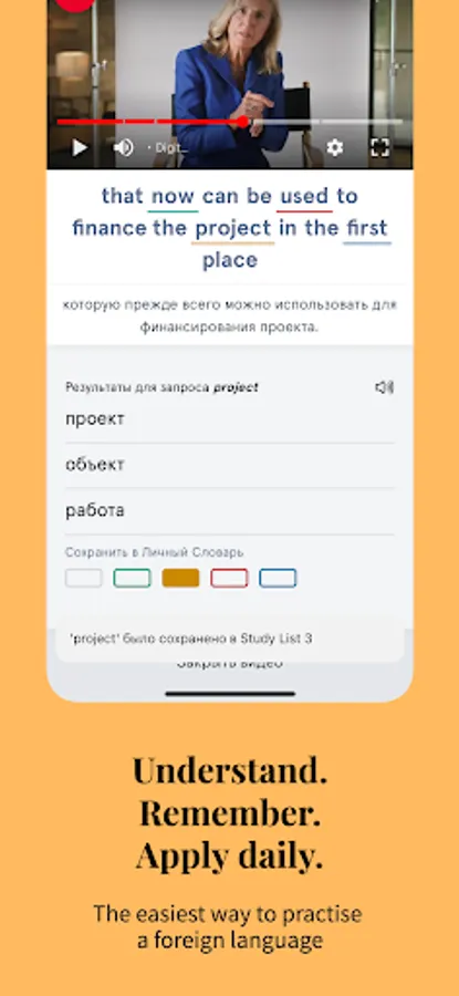 With brainstr, you can easily watch videos with both subtitles in your native language, as well as the language that you are learning. This powerful feature is great for helping you understand and retain phrases, as well as pick up on pronunciation. Plus, with each video watched, you can save words that caught your attention for easy reference later on. Once saved, you can access definitions and synonyms directly from online dictionaries to expand your understanding of particular terms or expressions.