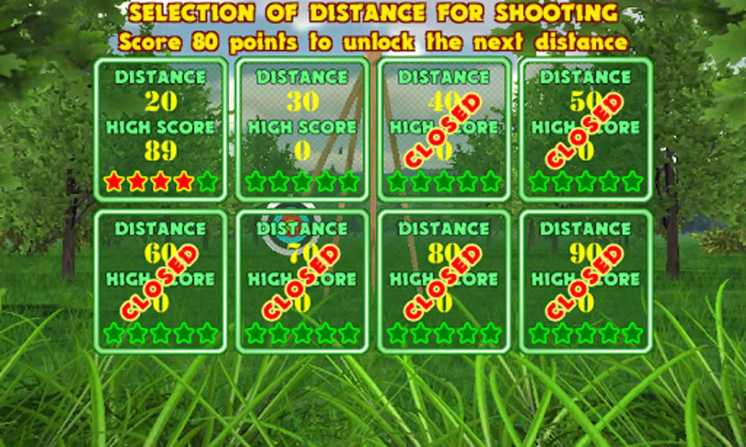Shooting is conducted at distances from 20 to 90 meters. At each distance are given 10 arrows. When you earn 80 points you will get access to the next range.