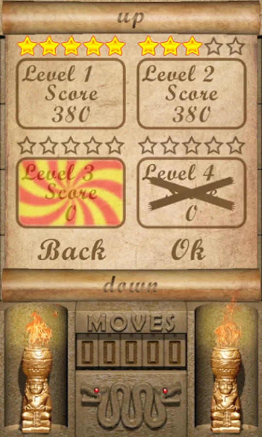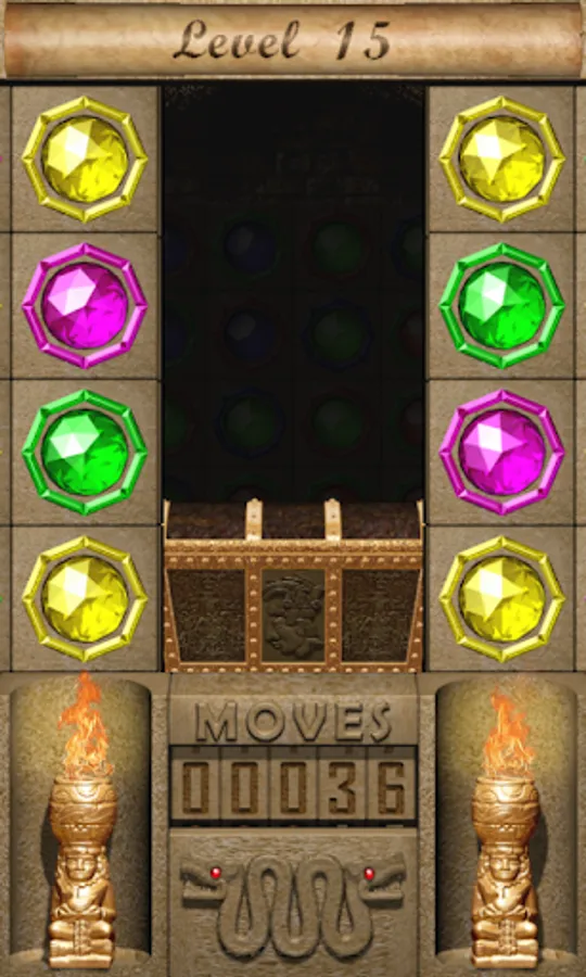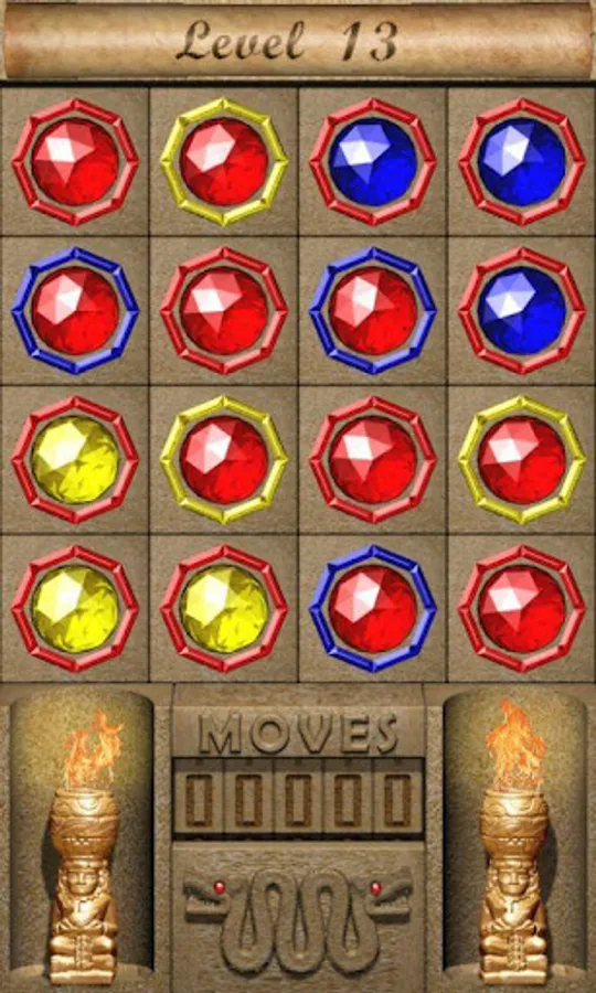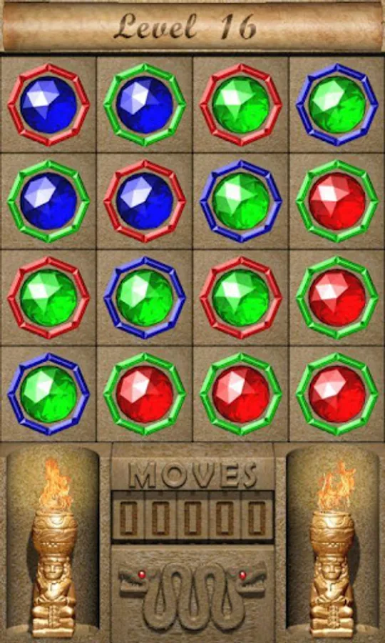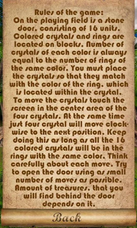 To move the crystals touch the screen in the center portion of the four crystals. At the same time just four crystal will move clockwise to the next position. Keep doing this as long as all the 16 colored crystals will be in the rings with the same color. Think carefully about each move. Try to open the door on the possibility of a smaller number of moves depends on how many treasures you will find her. If you can correctly place all the crystals, then the door will open, and the legendary gold Aztec will be yours.
