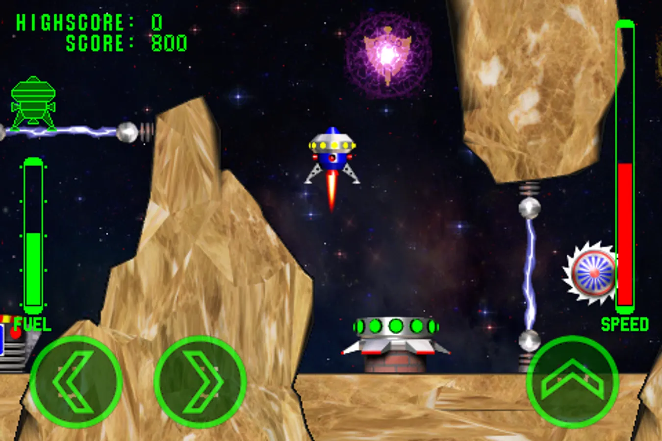 During the flight the ship affects the force of gravity of the planet, be careful when landing and do not exceed the maximum allowed rate of descent. When the rate of descent is permissible, speed indicator is green. At any collision with obstacles or at rough landing your ship receives damages up to complete destruction.