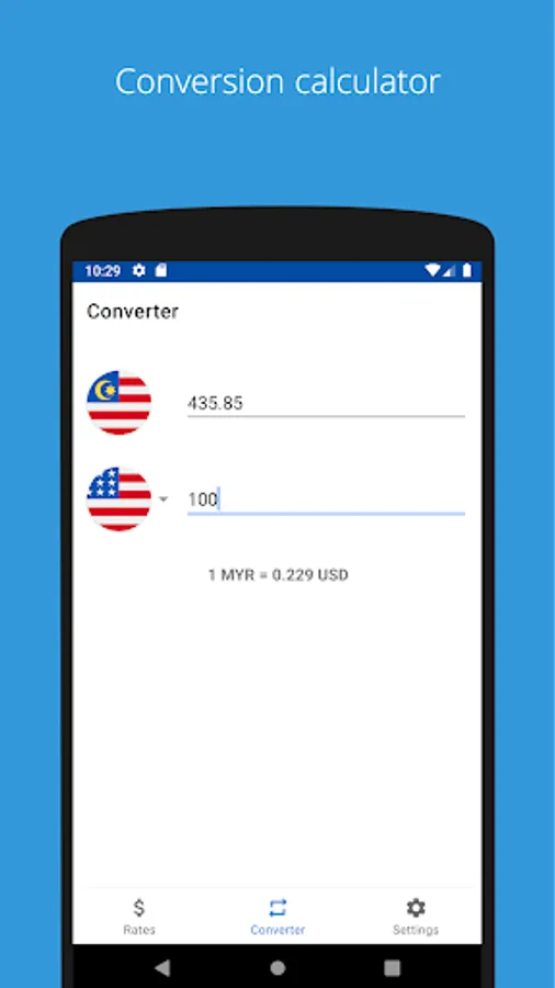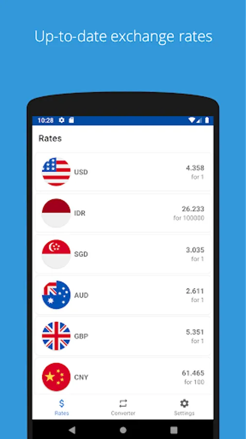 Application provide exchange rates from Malaysian Ringgit (RM / MYR) to USD, EUR, GBP, AUD, SGD, HKD, JPY, KRW, CNY, IDR, INR, THB and PHP.