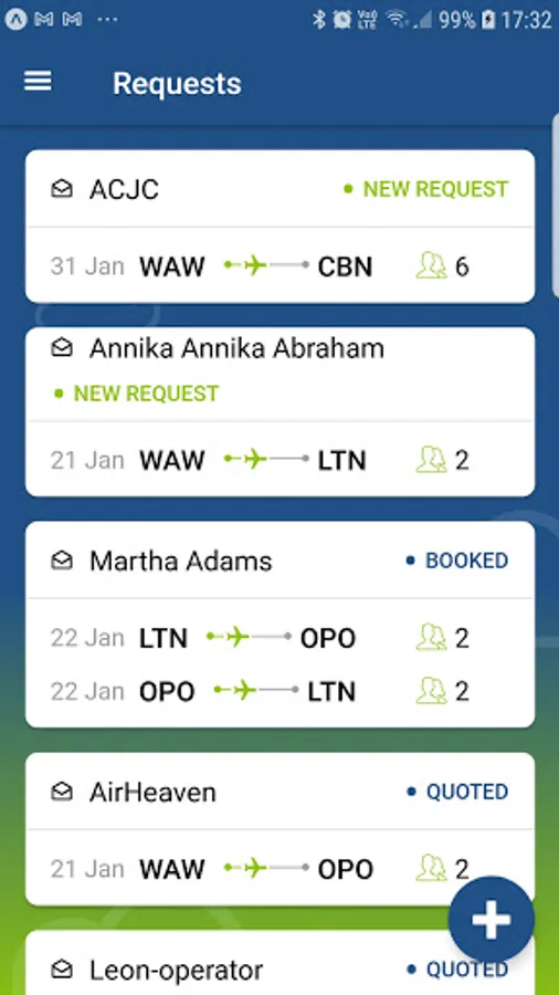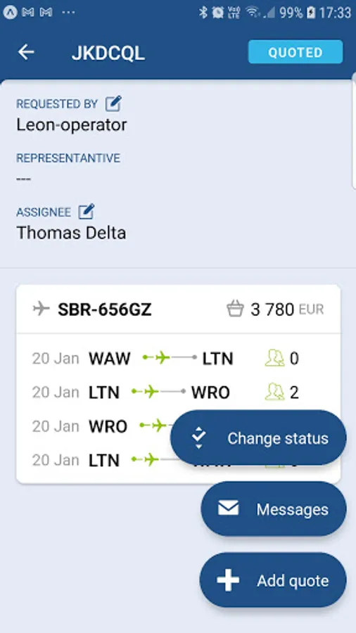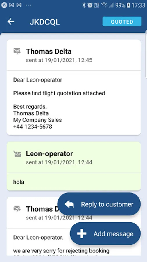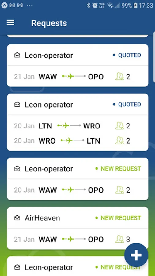 The Leon Sales mobile app is intended for Leon users involved in sales. The application allows you to create, evaluate and send flight quotes. It also allows you to communicate with charter brokers and clients.