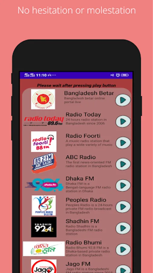 It is a simple fm radio.you needn't to subscribe or login.just click to play.No molestation or hesitation.Please wait after pressing play button.25+ FM Radio Station in this app.This app is built by leonswork.There are many apps in play store like this.but leonswork's apps is really different from other apps.you will understand the difference after using this app.Please give us your valuable review in play store.Thank you so much.