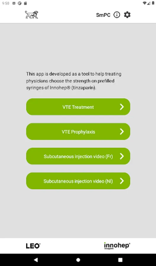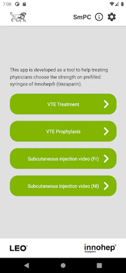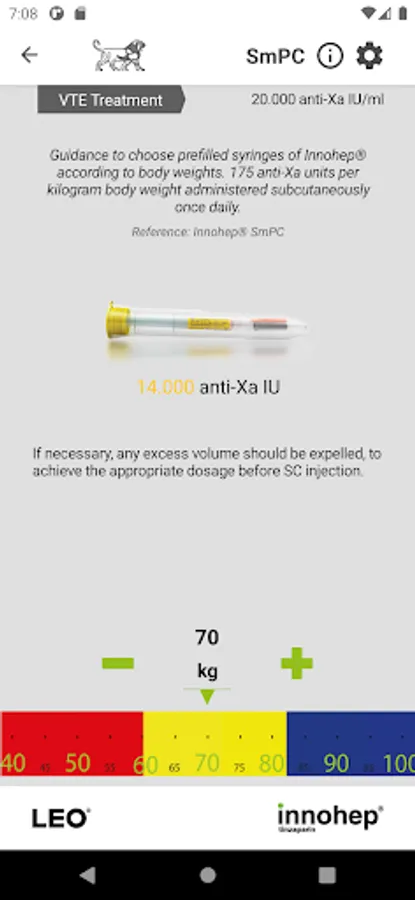 This Application is exclusively intended to accompany the prescribing doctor in the choice of the right strength of prefilled syringes of innohep® (Tinzaparin) according to SmPC and country specific commercialized syringes. This dosing app is not intended for use by patients or anyone who is not a doctor. They should always seek the advice of a doctor if they have any question about innohep® or their disease.