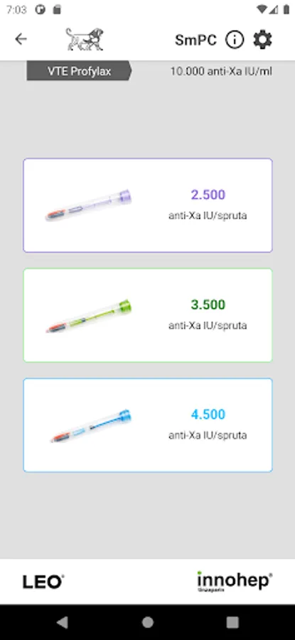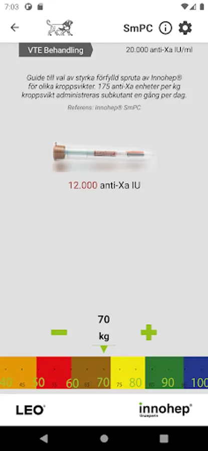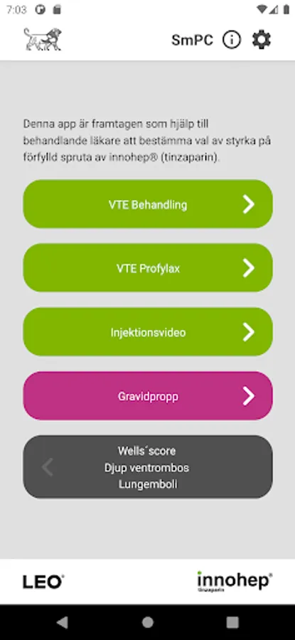 This app is designed to help the treating physician determine the strength of the pre-filled syringe of Innohep® (tinzaparin). Wells´score is a point-based diagnostic support to predict the probability of VTE before further investigations.