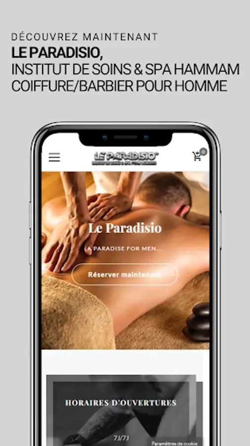 The Paradisio is a beauty institute dedicated to men with an area of 110m2. On the ground floor – a hairdressing/barber area including 3 hairdressing stations, a 13m2 Hammam inspired by oriental traditions including a bench that can accommodate up to 5 people, a scrub table without vis-à-vis, a balneo shower, then a Relax room with a magnificent starry sky so you can rest and relax while enjoying a cold / hot drink. Then upstairs – you will find 4 beauty cabins for all your face and body treatments, massages or for specific treatments desired, equipped with a hydromassage shower for a real moment of relaxation and relaxation.