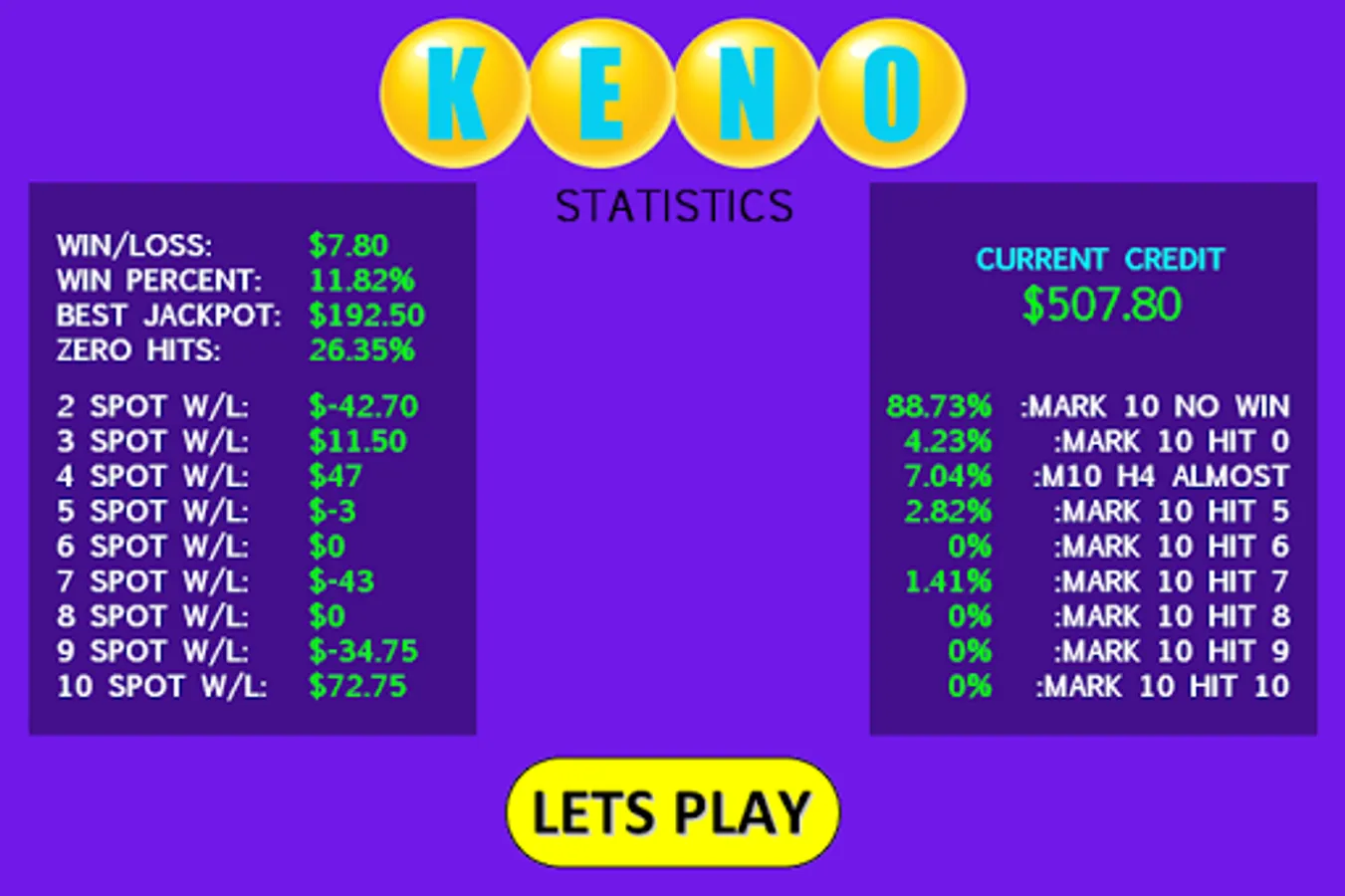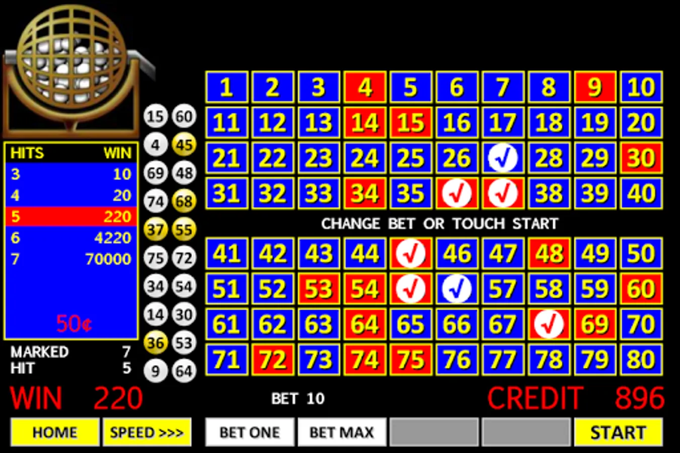It works similarly like a lottery; place a bet, mark 2-10 numbers and hope the machine picks some, or all, of your numbers chosen from the 20 randomly selected ones. If you hit a certain amount of numbers then you win. The more numbers you hit the more credits you get!