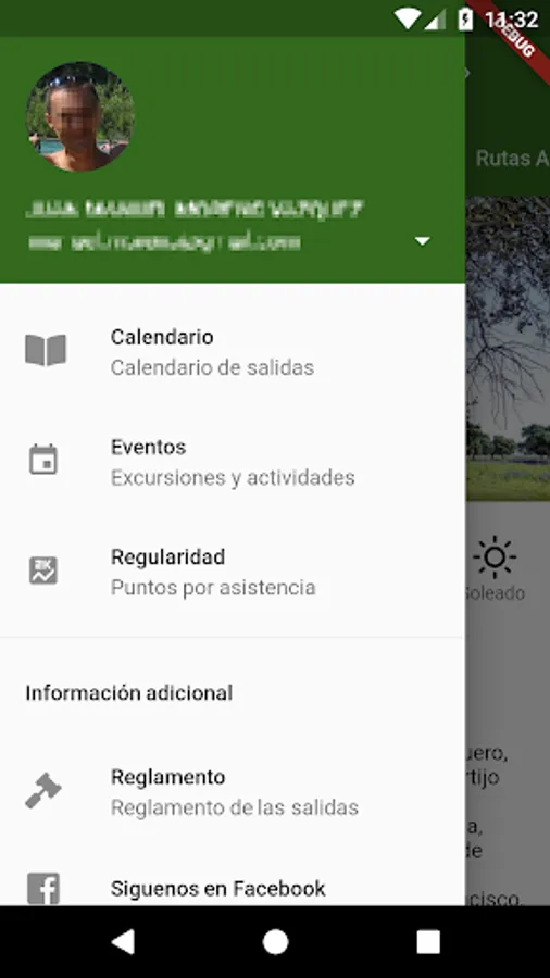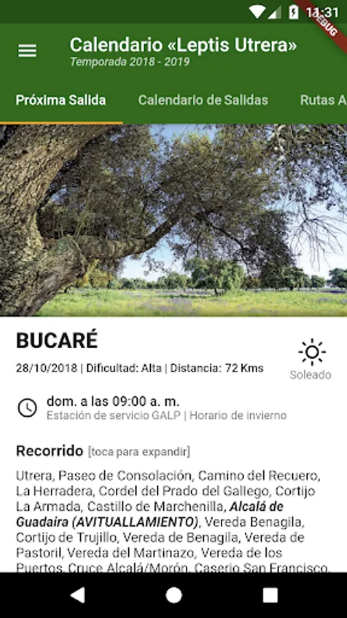 - Next exit: shows the detail of the next departure according to the defined schedule. You will have information about the route to be taken, the distance, the difficulty, the route map and a forecast of the weather (only 3 days before departure).