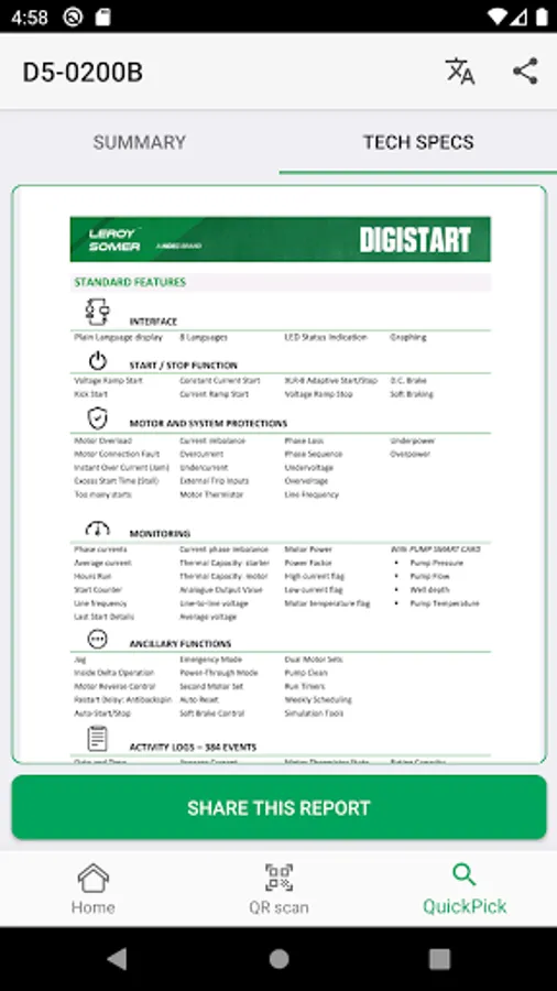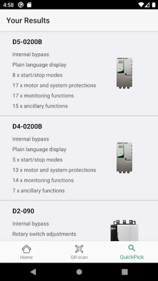 During operation the D4/D5 soft starter monitors and protects you motor and machine. When a fault condition is detected the starter trips to protect your system and displays the trip cause on the local control panel. If the operator is not trained or qualified to diagnose and reset the system, the Leroy-Somer Digistart app allows them to upload and e-mail operational and trip data to support staff. It’s as simple as taking a photo and forwarding a message.