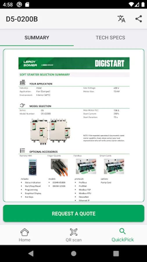 Provide some basic details including industry, application, and motor size, and the Leroy-Somer Digistart app will suggest a suitably rated model for each available product range. Select a recommendation to see a full list of features and products specifications, with the ability to share the document at the push of a button, or request a quote from your nearest Leroy-Somer sales office.