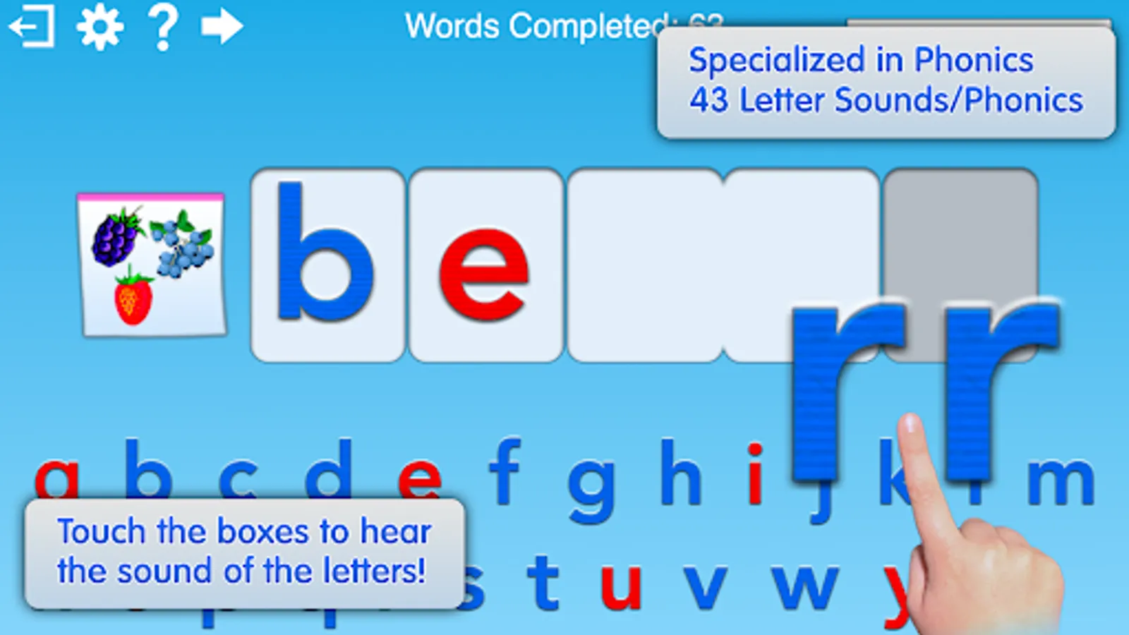 • First, the app helps kids understand that words are made up of sounds/phonics (phonemic awareness). For each word, your kids can touch the empty rectangles where letters must be dragged to complete the word, and hear the sound the corresponding letter(s) produces.